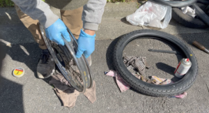 そして新しいタイヤを膝とかで抑えたりしてタイヤを取り付けます。